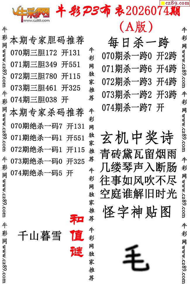 牛彩P3布衣26年074期AB版图谜(精华版)-3d开机号-3d开机号今天_3D开机号结果查询_千禧3d福彩开机号和试机-福彩3D